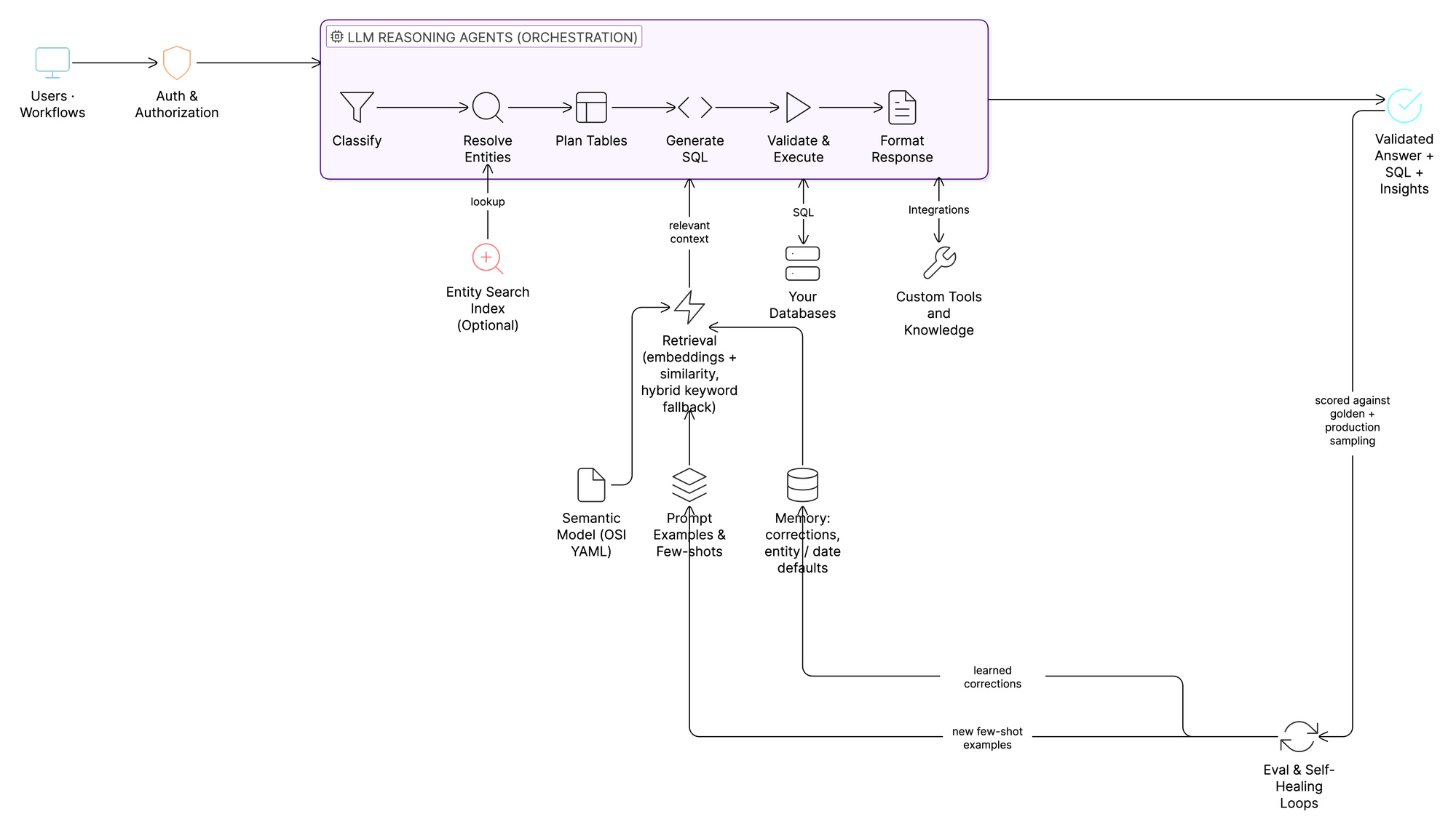 Multi-stage agents that compound the LLM's strengths and contain its weaknesses. Specialized agents working in sequence: classify the question, resolve the entities it mentions, plan which tables to join, generate SQL in the right dialect, validate it, execute it, and format the response. Each stage gets rich context from the prior ones (via the retrieval layer above), and each is independently improvable. Crucially, the reasoning is done by a frontier LLM (Claude, GPT, Gemini). We don't ship a custom model. We ship the orchestration around one.